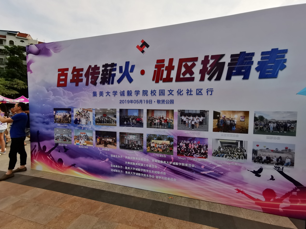 5月19日下午,以“百年传薪火,社区扬青春”为主题的第十二届校园文化社区行在集美银亭社区敬贤公园举办,本次活动由集美团区委、集美街道团工委与我院团委共同主办,我院学生社团联合会承办,银亭社区居民委员会和我院社团协办。