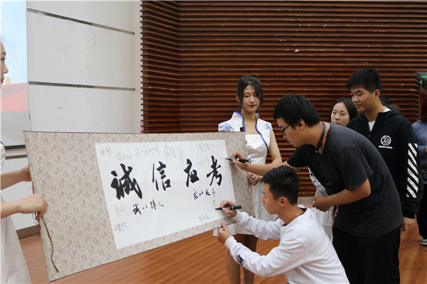 院团委工作部门的负责人根据本学期工作进行了简要的总结,指出了一学期来工作取得的成绩和不足,并提出了未来的工作规划。相关指导老师分别为“星级部门”及“星级部长”颁奖,对他们过去一学期的工作和努力表示肯定。院团委主要学生干部宣读了诚信应考倡议书和诚毅学院考试规章制度,共同呼吁大家诚信应考,各部门工作人员代表们纷纷在诚信应考承诺板上签名。本次大会全面回顾了团委本学期的工作情况,让同学们能够在肯定和反思之中更清晰了解了共青团工作的性质和要求,为下一阶段的共青团工作的开展做足准备。同时,本次会议也使同学们提高了诚信应考的意识。