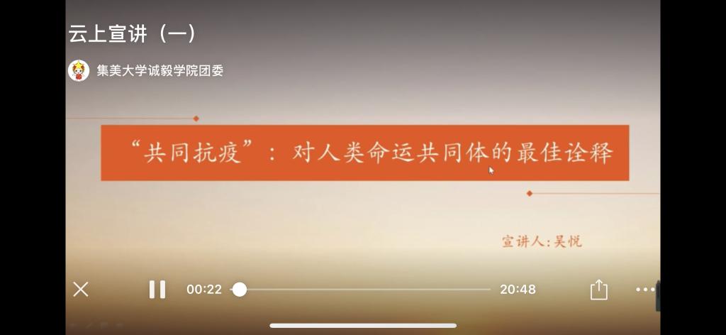 自5月4日“云上宣讲”专题宣讲第一期《“共同抗疫”:对人类命运共同体的最佳诠释》正式推出以来,至今累计观看7000余人次,引起了学子们线上、线下的热烈讨论。诚毅团员青年积极学习“云上宣讲”内容,以宣传防疫知识为己任。在充实自我的同时,更辐射周边的亲朋好友,真正做到以讲促学、以学促行。