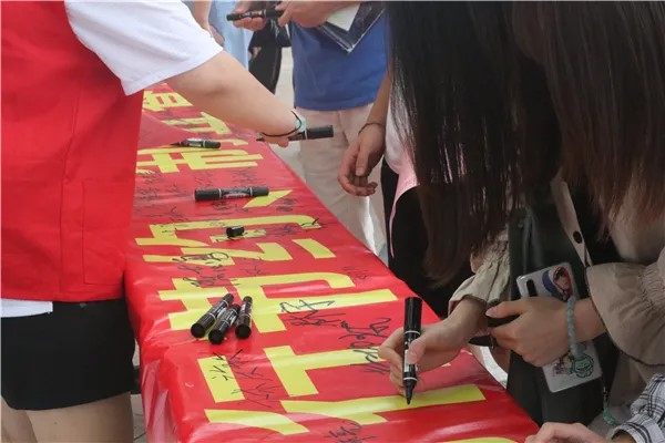 红色宣传单承载着志愿者们宣传节俭美德的热情意志,志愿者们握着沉甸甸的心愿,向来来往往的学子们介绍“倡议光盘行动”志愿活动,并引导他们在横幅上签下姓名,以示郑重的承诺。本次活动很好地唤醒和展现诚毅学子对劳动成果的尊重和节约意识。