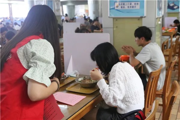 为了做好师生用餐疫情防控,疫情防控志愿服务队责食堂用餐人员测温、引导等工作。餐厅疫情防控志愿服务活动一天有三个班次,每个班次有19名志愿者服务,进行入口测温、用餐引导、文明督导等工作,保障常态化疫情防控下师生安全有序用餐。