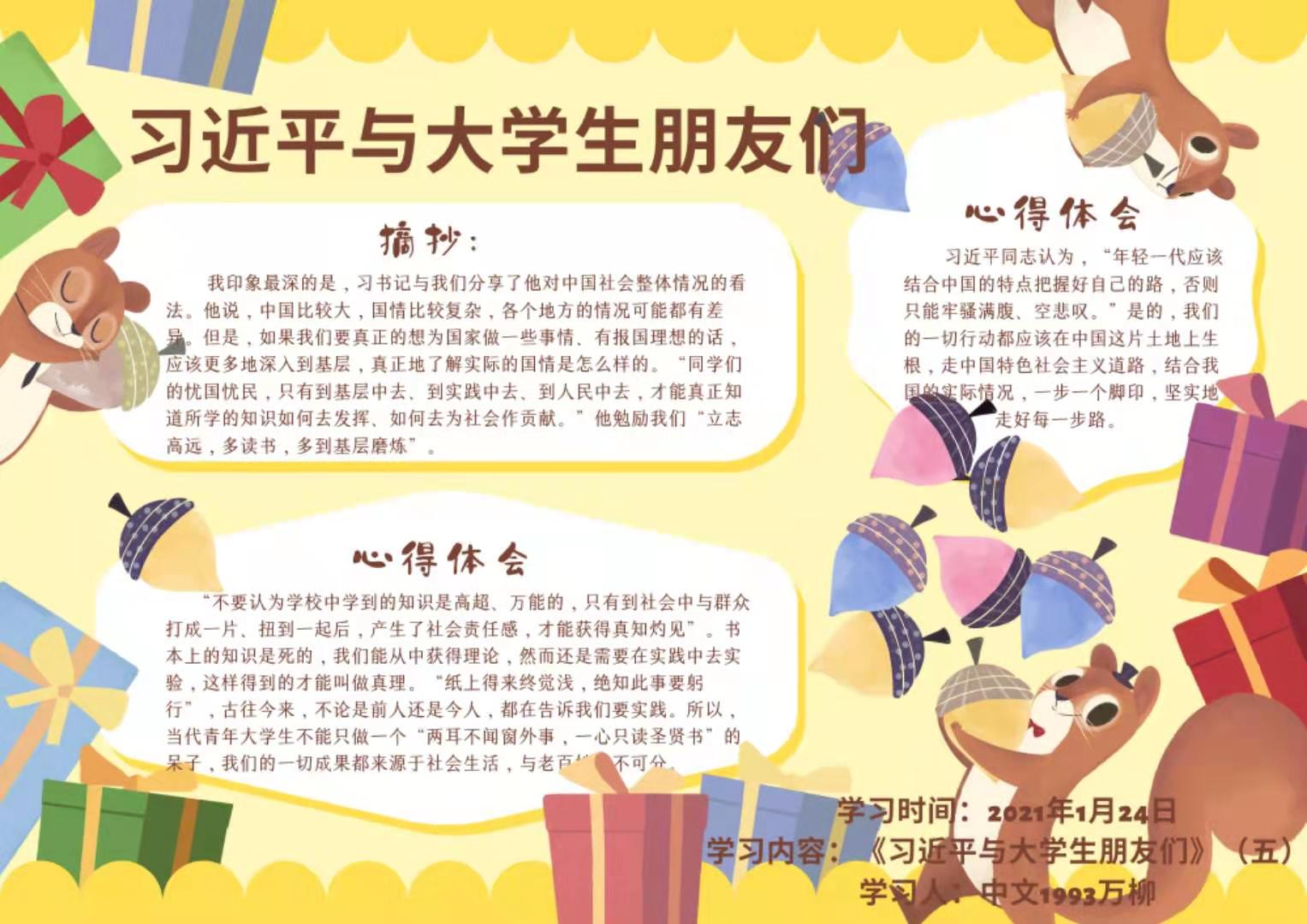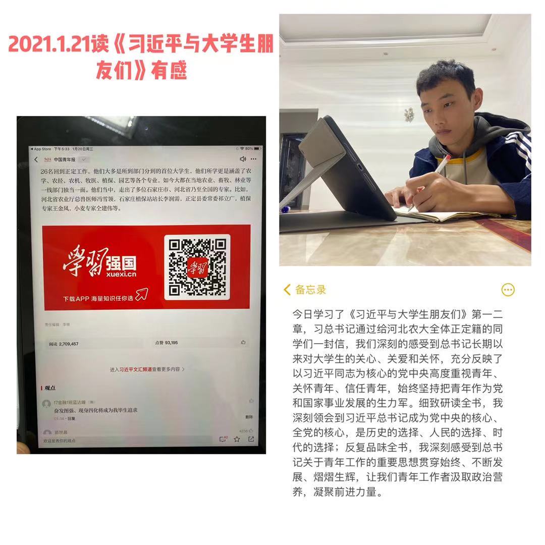 我院组织青年开展形式多样的读书活动。通过以班级团支部、学生组织为单位开展《习近平与大学生朋友们》学习活动,以线上线下主题团日、主题团课等载体,每个班级团支部至少开展1次集中性专题学习活动,每名团员青年至少参加1次集体学习活动。“青马俱乐部”的同学们在寒假期间以小组为单位开展线上学习打卡活动,还将学习《习近平与大学生朋友们》的精彩片段、学习心得成果制作成学习卡片进行展示分享。