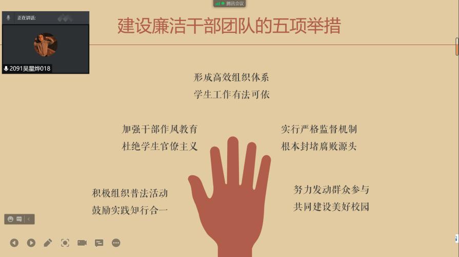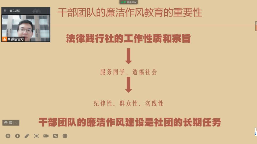 10月2日晚,集美大学诚毅学院法律践行社于社团内组织开展了廉洁教育交流会。会议响应国家、学校居家防疫号召在线上举行,围绕“树服务意识,养清廉之风”这一主题展开。法律践行社主席团成员以及法律践行社各部部长、副部长出席本次会议。