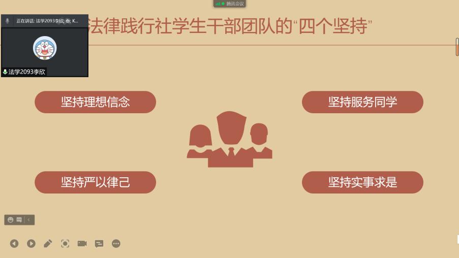 会议伊始,社长吴博炜提到,法律践行社作为诚毅学院规模最大、最具影响力的社团之一,具有很强的组织性、实践性和群众性,期冀社团各级干部能够在工作中做到“坚持理想信念、坚持服务同学、坚持严于律己、坚持实事求是”这四个“坚持”。同时,针对社团的廉洁作风建设,吴社长还提到,社团应当形成高效的组织体系,严格监督机制,加强对干部团队的作风教育,并积极鼓励社会实践,发动广大同学共同参与,共建美好的社团工作环境。会议最后,吴社长对这次会议进行了总结,并表示了对社团未来廉洁建设的期望:希望全体社员团结一致,公私分明,杜绝一切以权谋私、学生官僚主义现象,革除一切沉沉暮气,把法律践行社建设成学院组织最严谨、最团结、最进取的学生团队。对此,各部门干部回应,在其位而谋其事,在接下去一年中将继续努力学习、运用所学的知识服务同学、造福社会,且团结干部干事,做到一切从实际出发,共同建设美好校园与温暖社团。