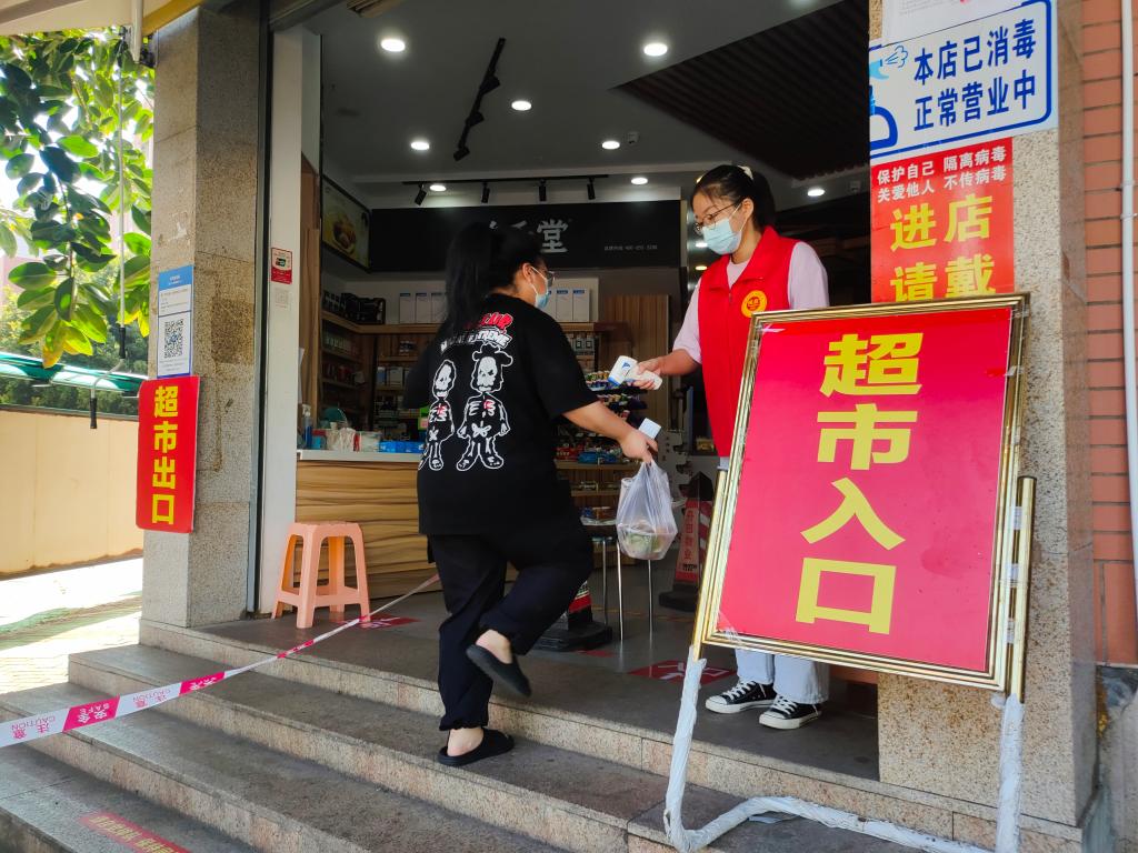 随着疫情防控形势的不断变化,超市、操场等处成为人流量聚集的地方,为了保证校园有序活动、减少人员聚集,文明督导先锋队志愿者们在超市等人员活动较为频繁的地点进行志愿服务活动,进行体温测量,提醒佩戴口罩、保持间隔等工作。