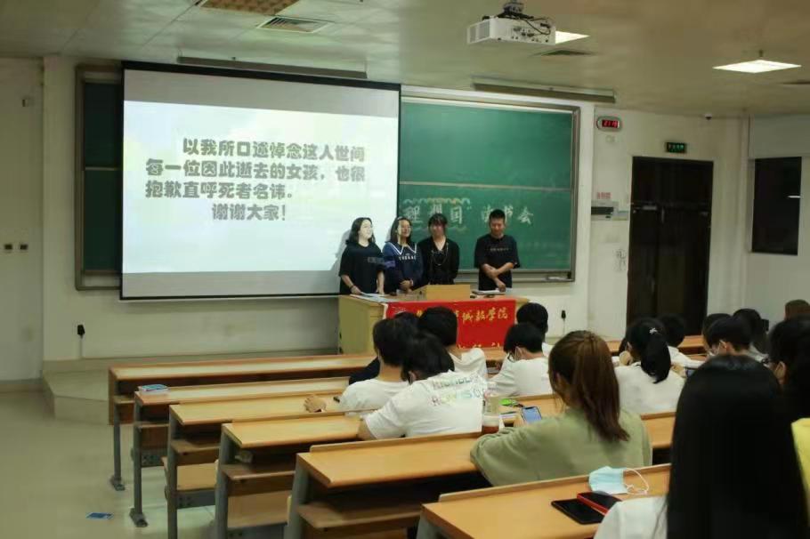 其后C组同学为大家带来已故作家林奕含的《房思琪的初恋乐园》,无论是本书里的故事情节还是本书在现实生活中发生的事实原型,都是以悲剧结尾。正因如此,C组同学全员穿着黑衣来表达对死者的敬重与悼念。从此书中,C组同学为我们引申了当今社会中几个急需解决的问题:“家庭性教育的缺失”,“网络暴力”,“性侵受害者不敢发声与心理创伤无法疗愈”等,这些案件本身使人深刻,案件背后又使人深思。