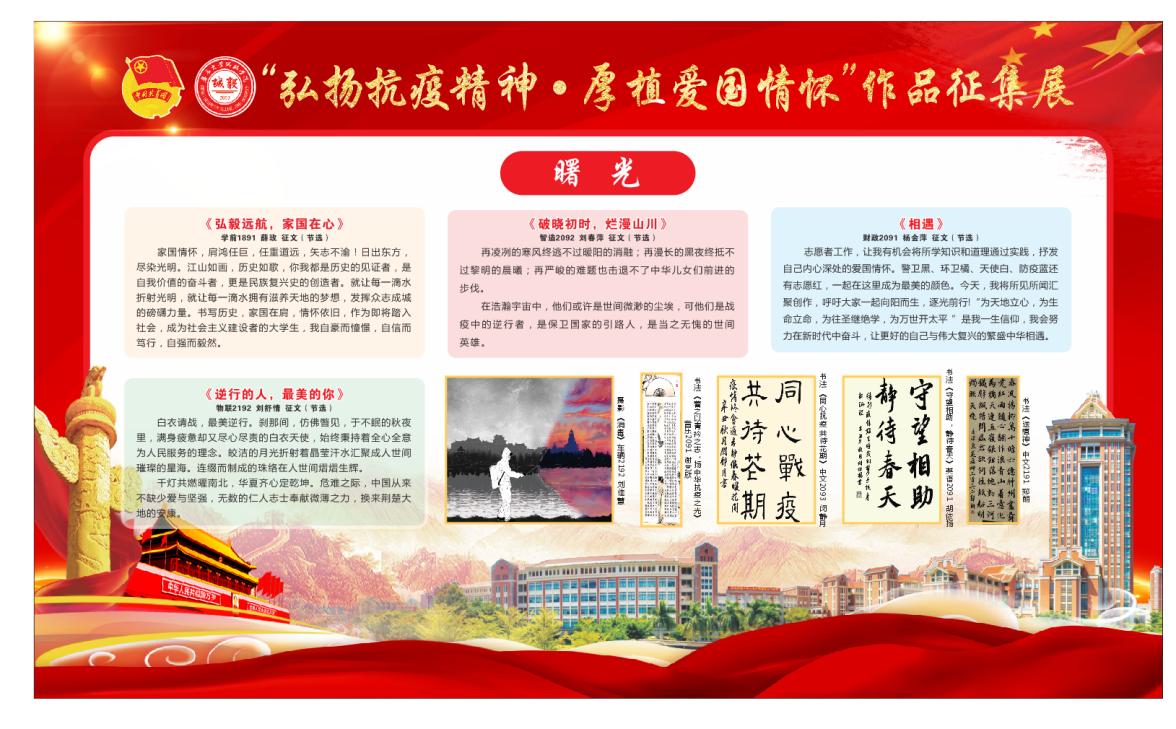 11月25日,“弘扬抗疫精神•厚植爱国情怀”主题作品展落下帷幕。院团委自10月5日起,面向全院开展“弘扬抗疫精神•厚植爱国情怀”抗疫作品征集活动,活动为期两个月,全院学生踊跃参与,共征集到100多件作品,其中包括书法、征文、绘画、海报、朗诵和摄影作品。经过层层筛选,共有29幅学生作品被展出。