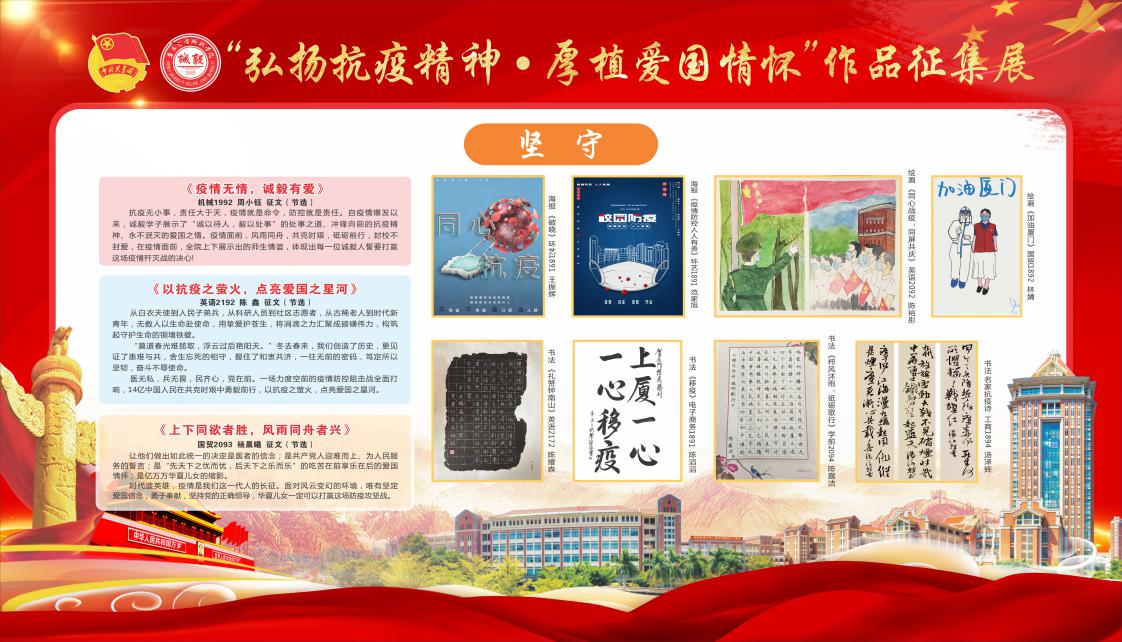 本次的作品展览分为:“集结”“坚守”“曙光”三大板块。“集结”板块体现了面对本次突如而来的疫情,白衣天使们在第一时间内快速集结,逆流而上;我院的志愿者严阵以待,为学院的防疫工作汇聚团结的力量。“坚守”板块则体现了我院师生众志成城,共克时艰,齐心协力抗击疫情。“曙光”板块呈现了诚毅学子在本次疫情中通过出色到位的防疫行动守护校园安全的过程,是全体厦门人同心向上、心手相连的一个缩影。