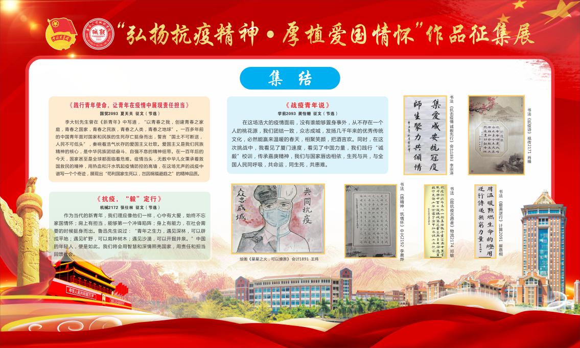 通过本次的征集活动,激发了同学们共同抗疫的强大精神信念和积极投身防疫工作的行动力;体现了诚毅学子不退缩、不畏惧,欣然肩负起作为青年人的担当,展现了诚毅学子在这场全民参与的疫情防控阻击战中众志成城,齐心抗“疫”的精神风貌。