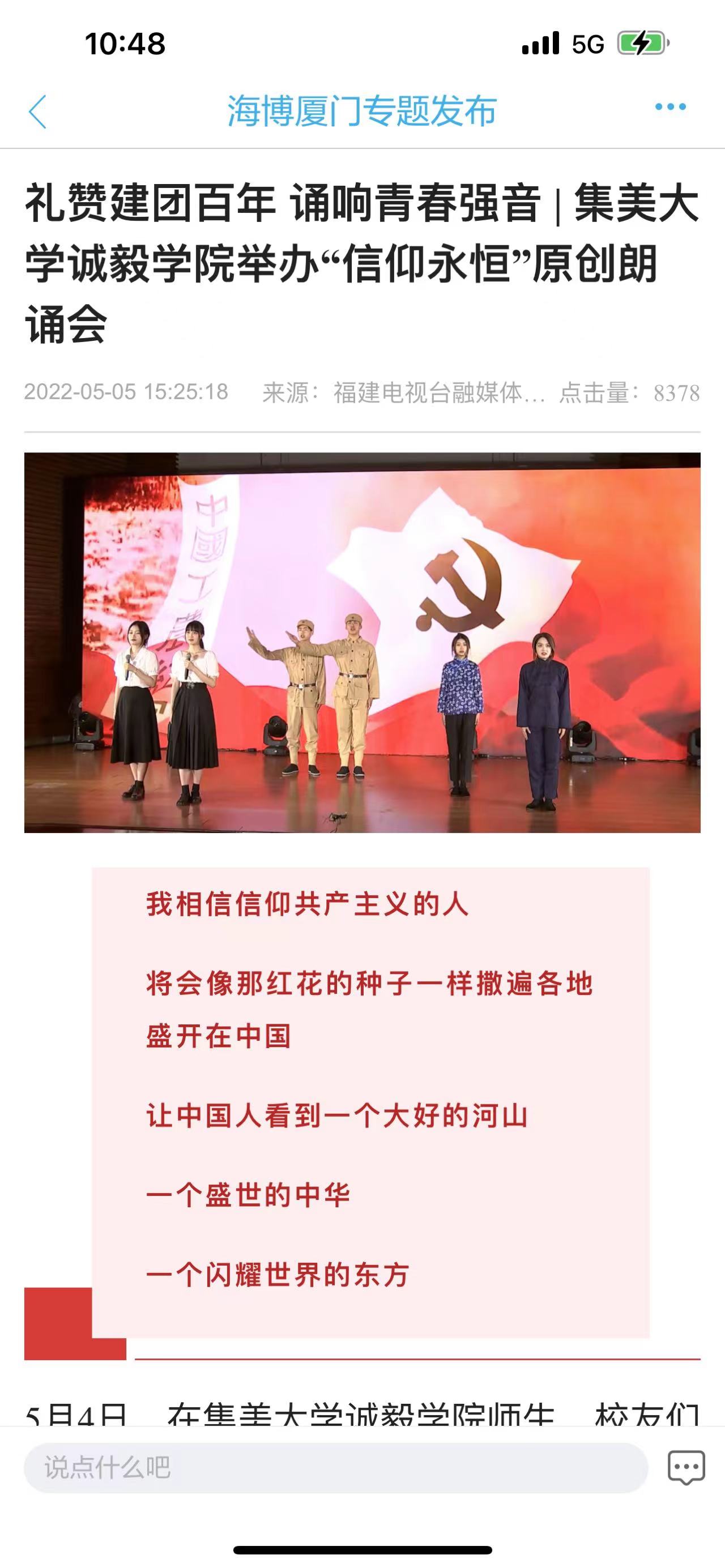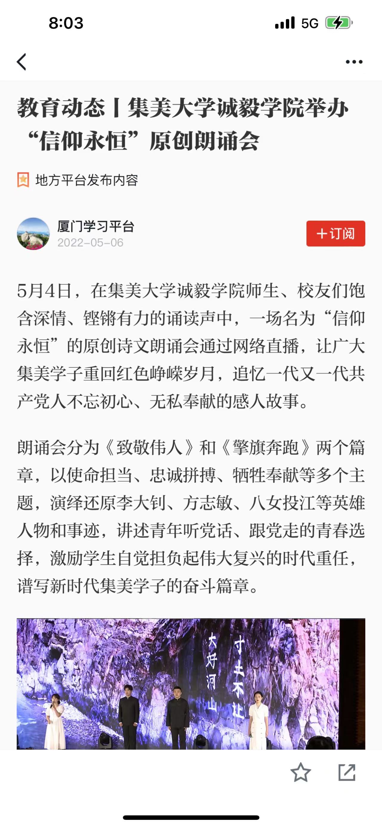 5月6日,学习强国厦门学习平台发布文章《集美大学诚毅学院举办“信仰永恒”原创朗诵会》。学习强国厦门学习平台:https://article.xuexi.cn/articles/index.html?art_id=10913745079131010827&t=1651835826965&showmenu=false&cdn=https%3A%2F%2Fregion-fujian-resource&study_style_id=feeds_opaque&source=share&share_to=wx_single&item_id=10913745079131010827&ref_read_id=b70aaf79-9468-4947-b21c-09486f61c595_1651979033494