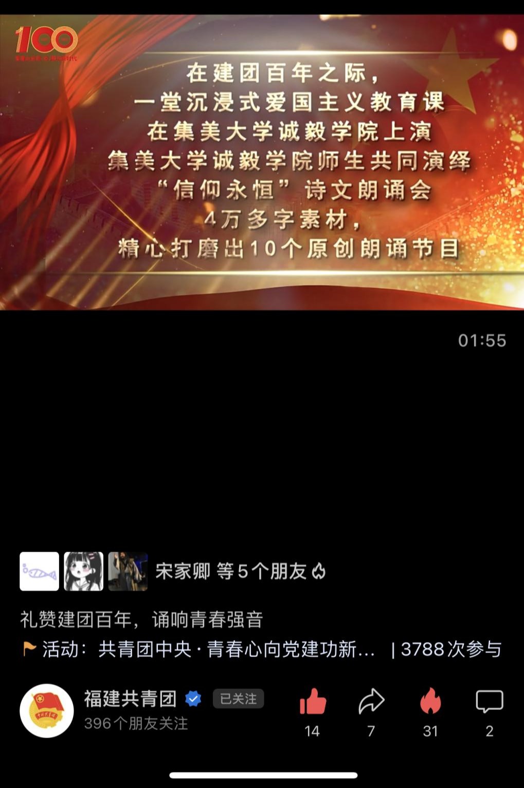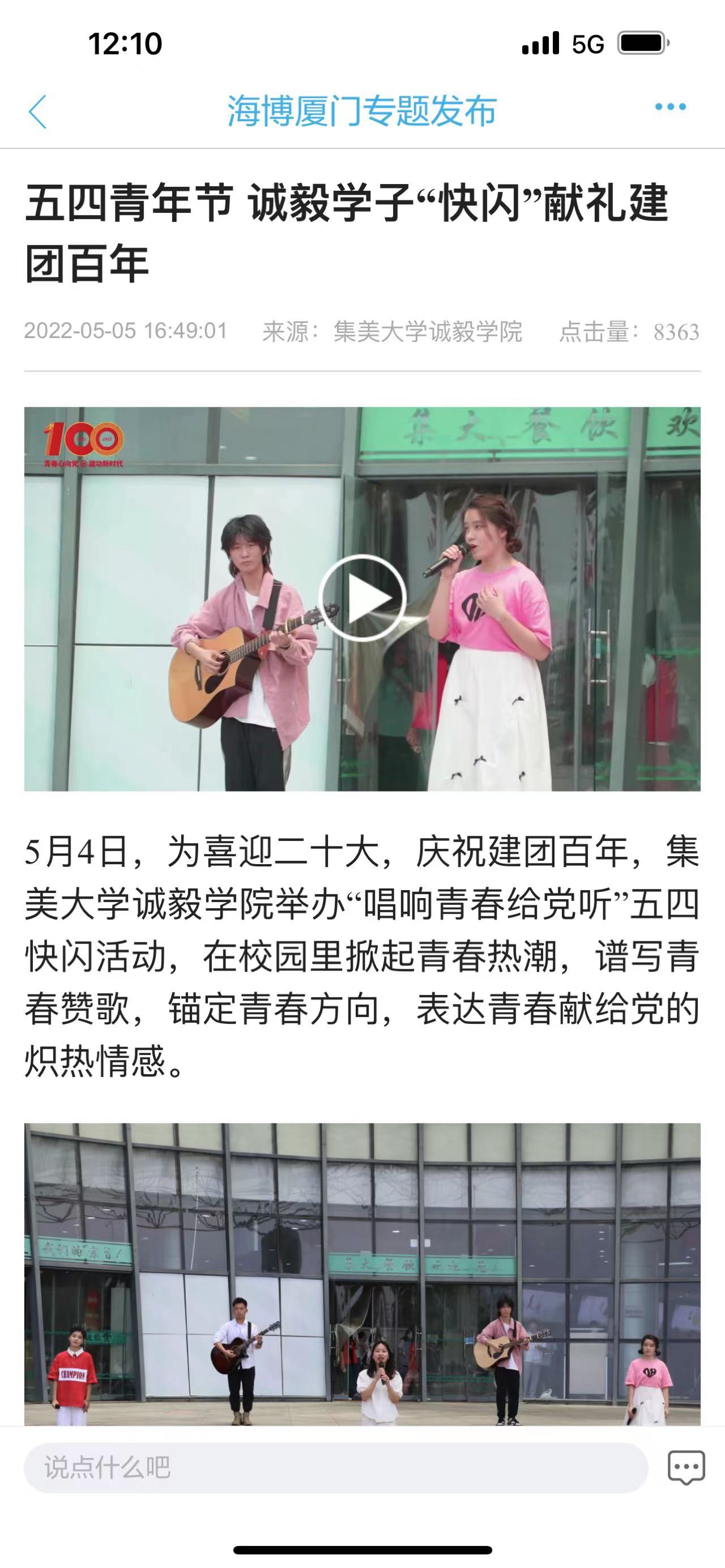 近日,为喜迎二十大,庆祝建团百年,我院举办系列庆祝活动,其中“唱响青春给党听”五四快闪活动、“信仰永恒”原创诗文朗诵会,受到福建广播电视台、学习强国厦门平台、福建共青团等多家媒体报道,报道转载如下: