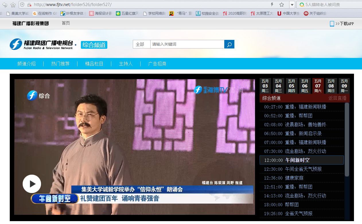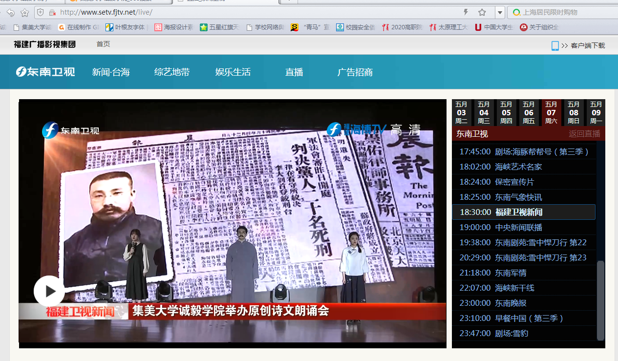 5月7日,福建广播电视台东南卫视《福建卫视新闻》、福建广播电视台综合频道《午间新时空》播报我院举办“信仰永恒”原创诗文朗诵会。