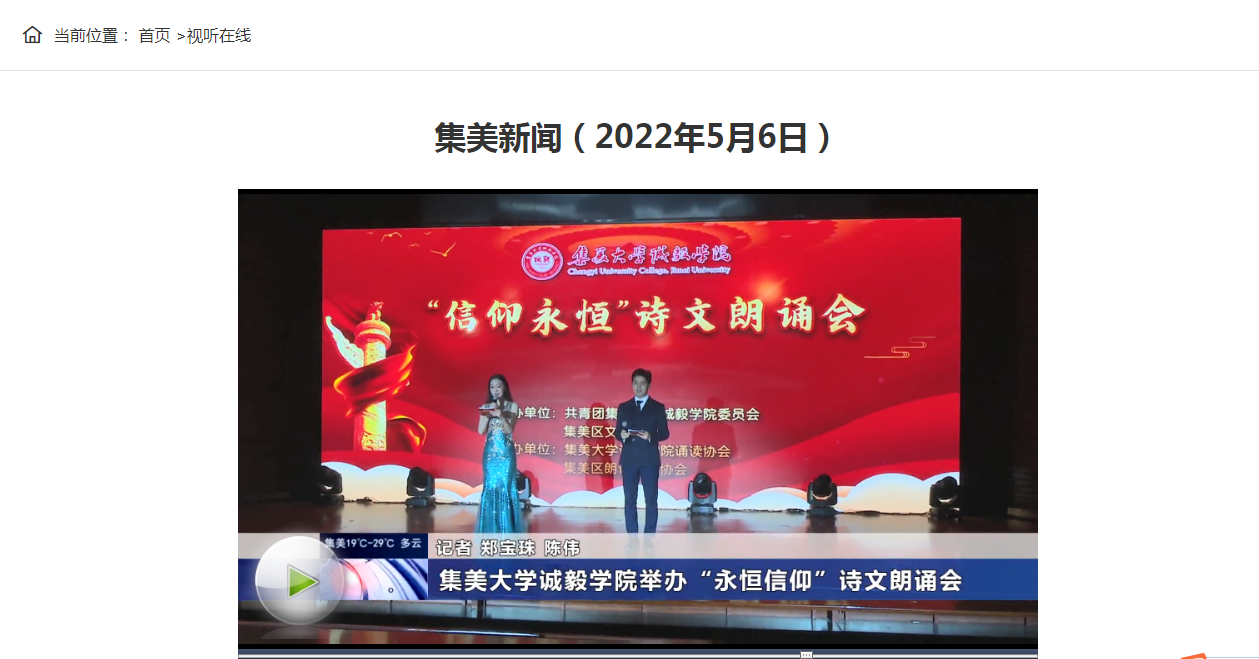 5月6日,集美报新闻播报我院举办“信仰永恒”原创诗文朗诵会。集美报新闻链接:http://video.jimei.gov.cn/mas/front/video/main.do?method=detail4Front&id=2582