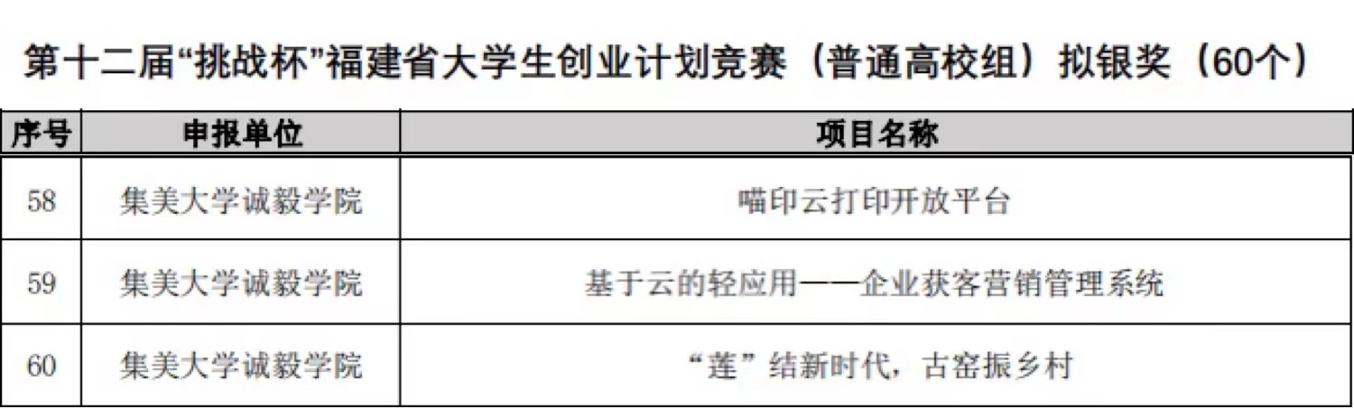 6月12日,第十二届“挑战杯”福建省大学生创业计划竞赛(以下简称“挑战杯”竞赛)评审结果公布。我院经评委评审,共遴选35个项目报送省项目办,最终我院《喵印云打印开放平台》《基于云的轻应用——企业获客营销管理系统》《“莲”结新时代,古窑振乡村》获得“挑战杯”福建省大学生创业计划竞赛银奖。