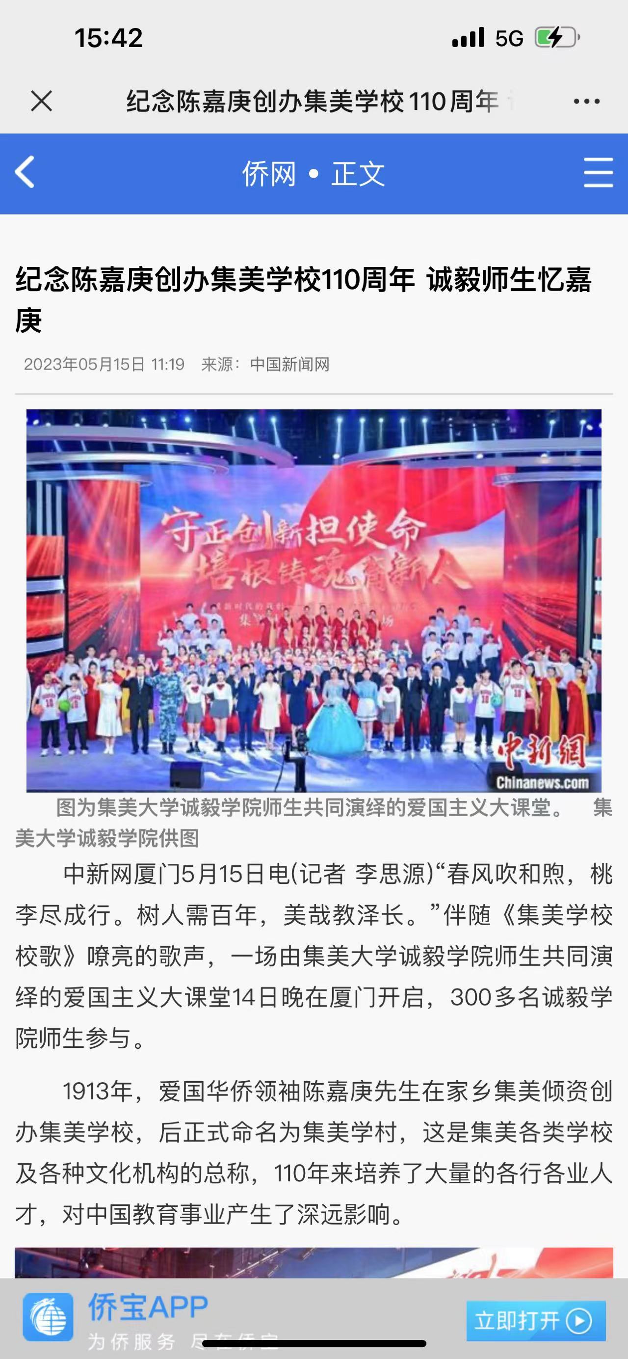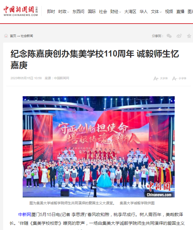 5月15日,中国新闻网发布文章《纪念陈嘉庚创办集美学校110周年 诚毅师生忆嘉庚》。