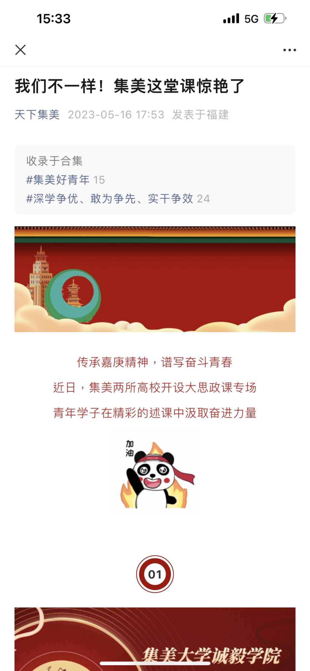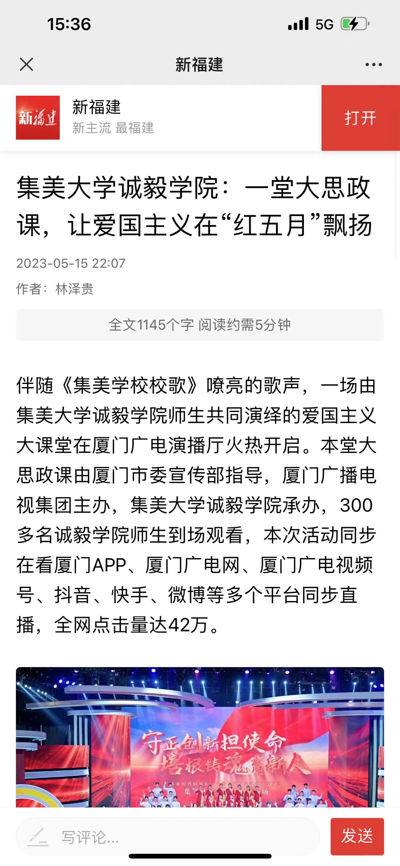 5月16日,天下集美公众号报道我院爱国主义大课堂活动。