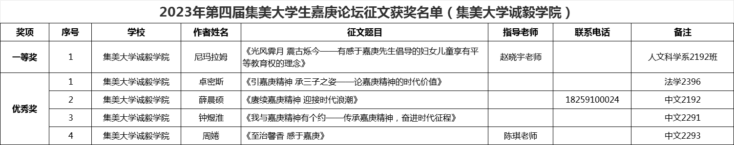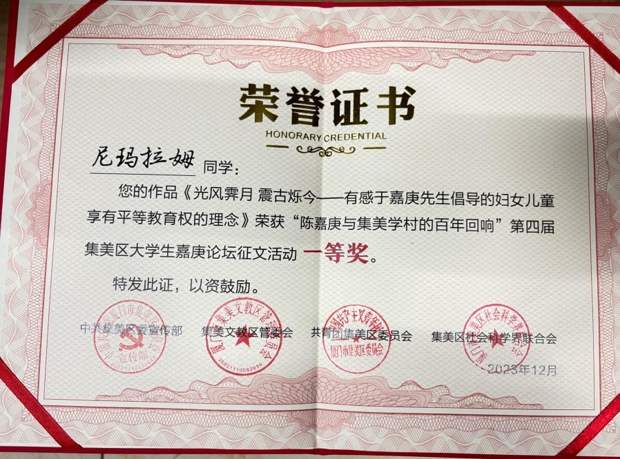 近日,第四届集美区“大学生嘉庚论坛”征文比赛结果揭晓,我院2021级法学专业尼玛拉姆投稿的《光风霁月,震古烁今——有感于嘉庚先生倡导的妇女儿童享有平等教育权的理念》荣获本届论坛征文比赛“一等奖”,法学2396卓密斯、中文2192薛晨硕、中文2291钟煜淮、中文2293周婘四位同学荣获“优秀奖”,赵晓宇荣获“优秀指导教师”。